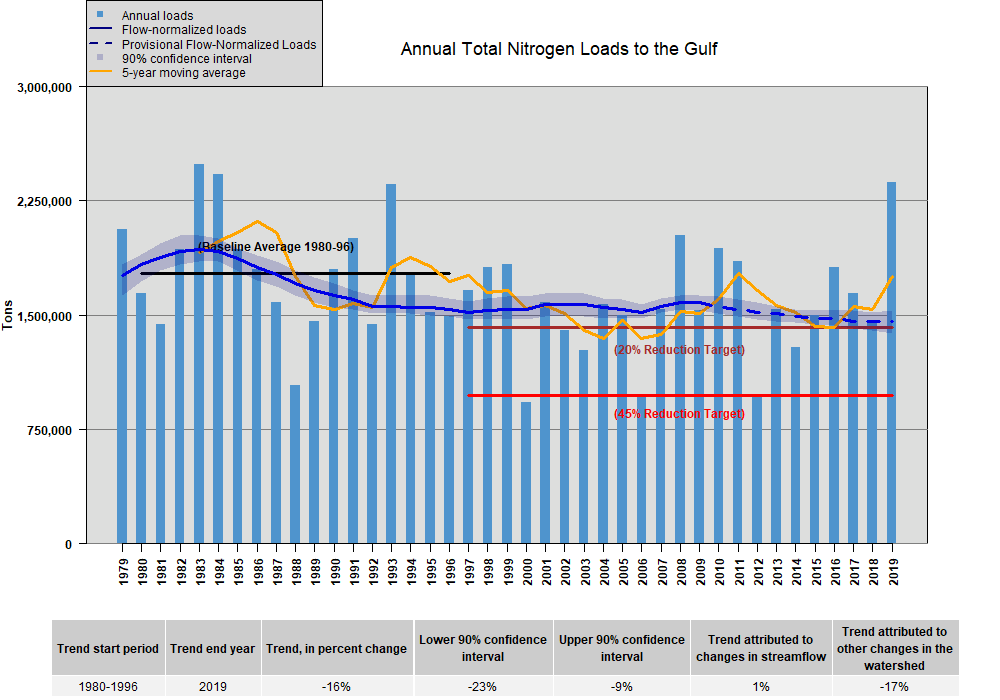 Figure 1. USGS Annual Total Nitrogen Loads to the Gulf (updated to 2019). Nutrient loads normalized for flow accounts for observed water quality loads and seasonality of stream flows.