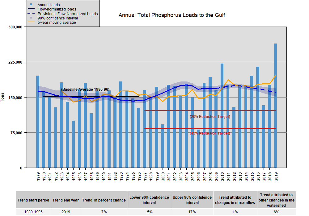 Figure 2. USGS Annual Total Phosphorus Loads to the Gulf. Nutrient loads normalized for flow accounts for observed water quality loads and seasonality of stream flows.